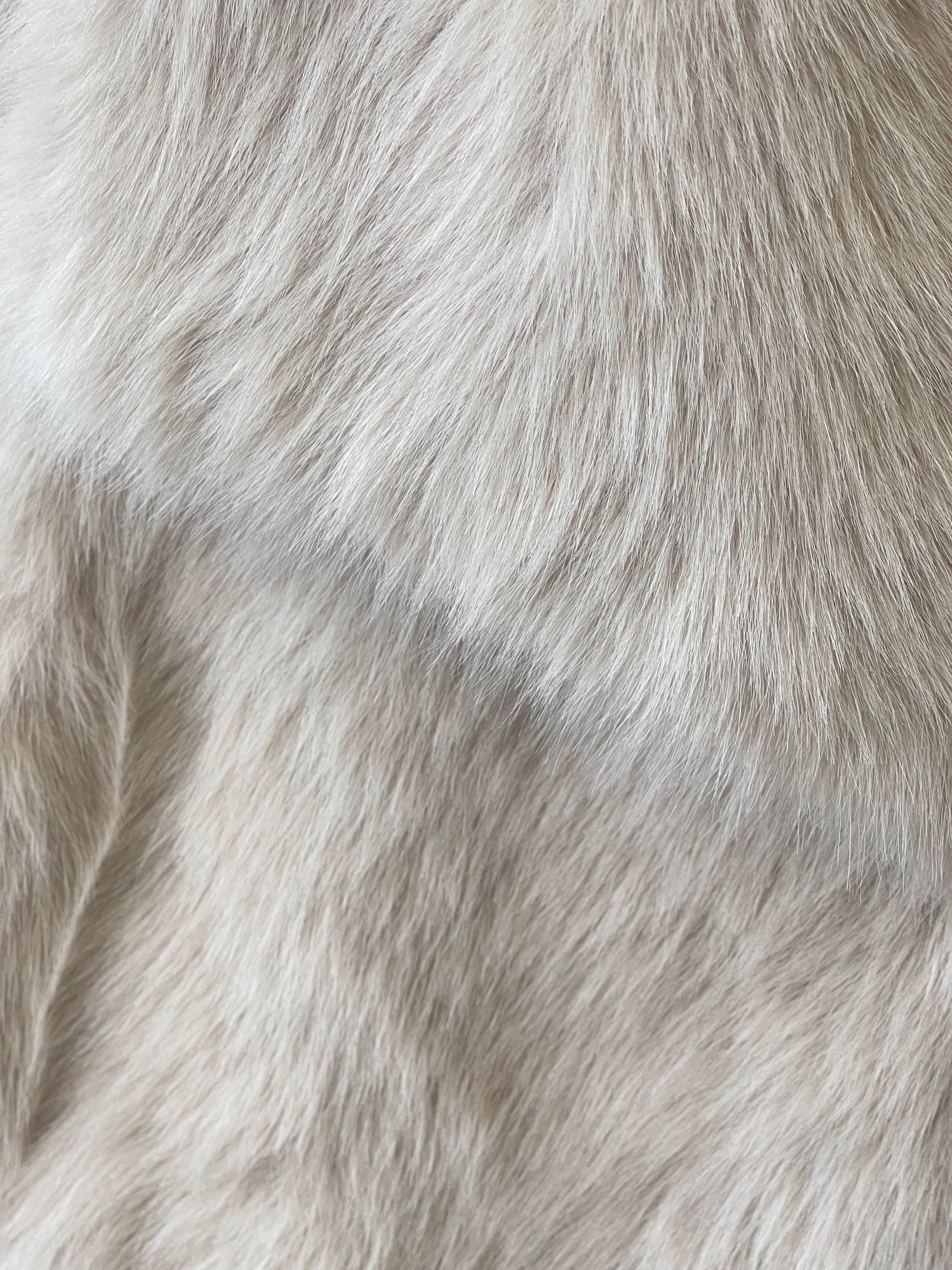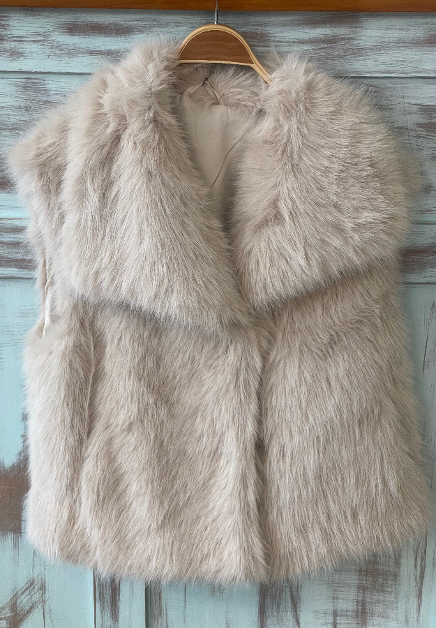 Abrigo de pelo beige sin manga con broche para cerrar.