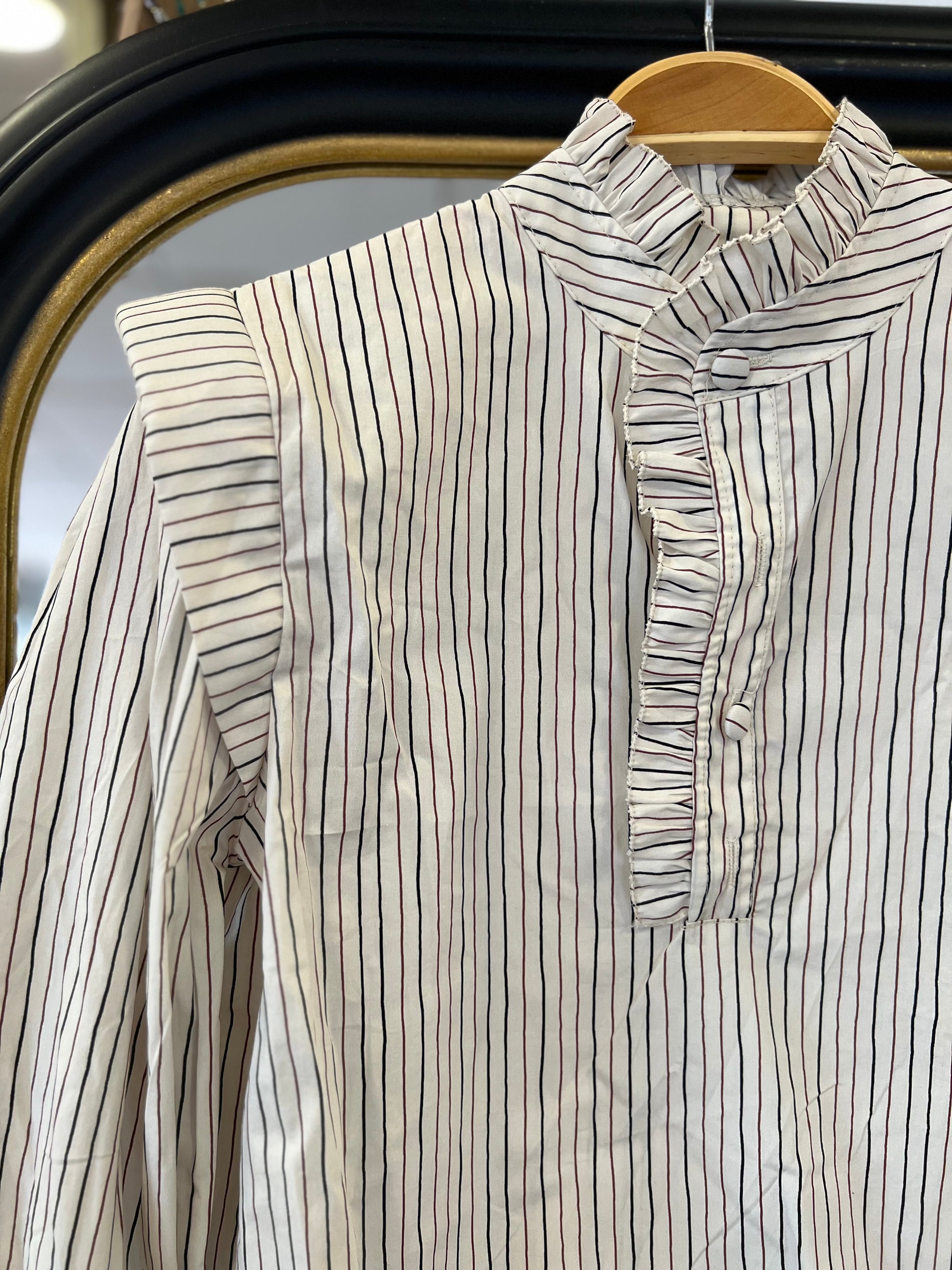 Blusa beige con rayas burdeos y negras.