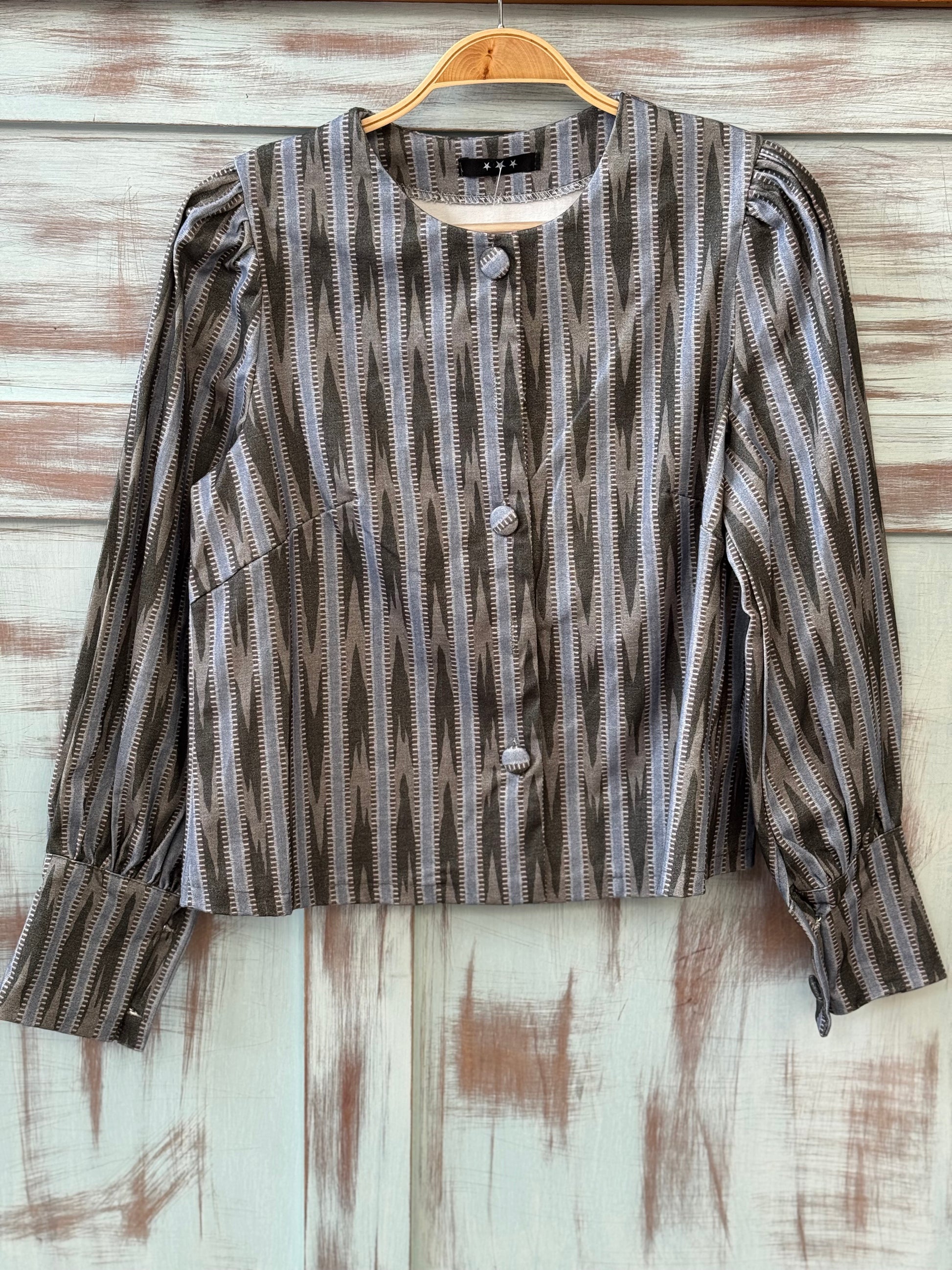 Chaqueta estampada abotonada en tonos azul, gris y verde.
