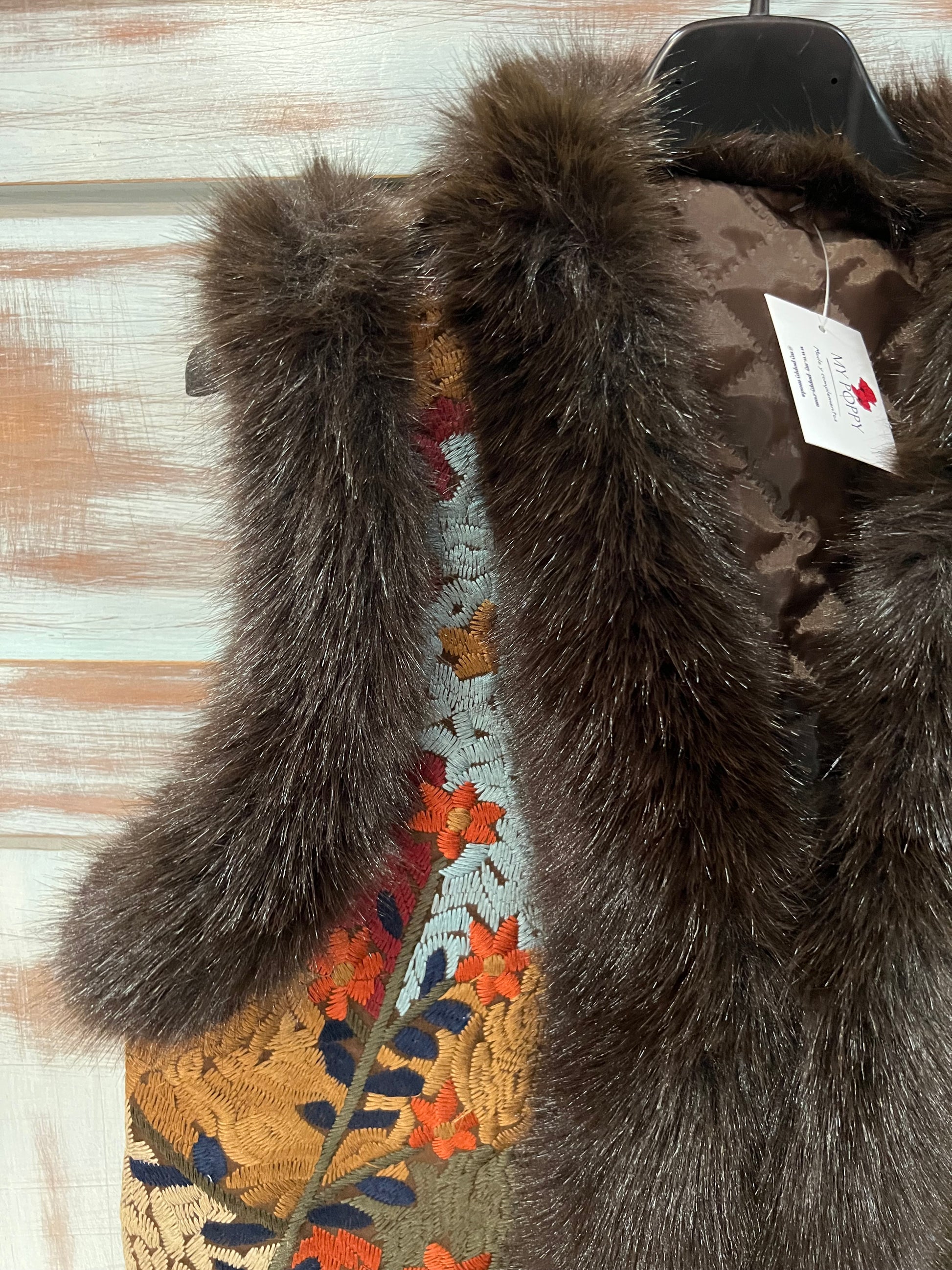 Bordes de pelo color chocolate y broche para cerrar.