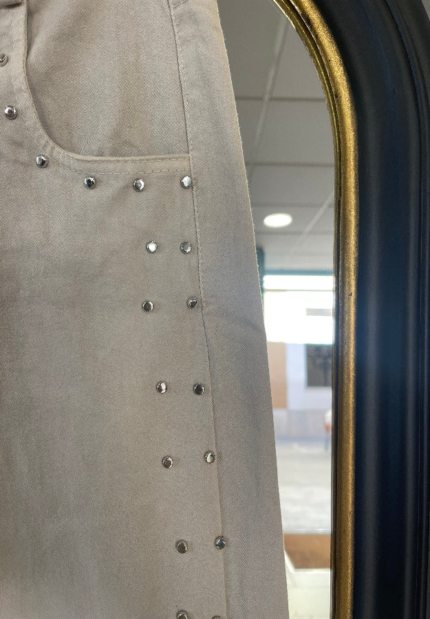 Pantalón beige con tachuelas.